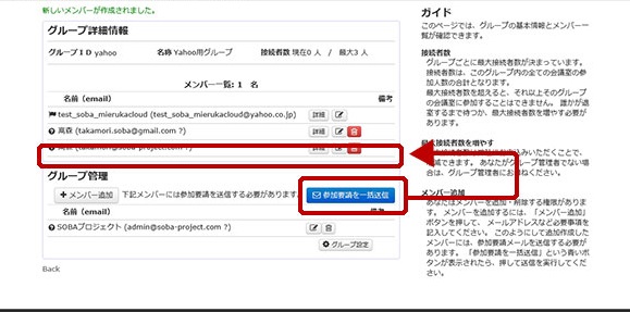 - 【グループ情報】画面に戻りますので、【参加要請を一括送信】をクリックします。